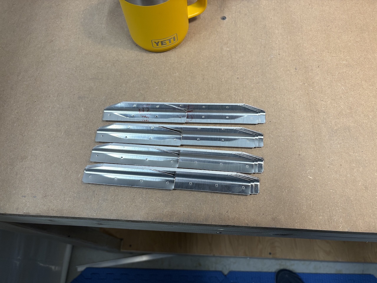 I made the fuel tank stiffeners today. These are attached to the fuel tank skins on the bottom in between the ribs to give a bit more support because the tanks will each hold about 140 pounds of fuel when filled.Here they are all cut out from the four big sticks that they came in. Then, lots of deburring with the scotch brite wheel to smooth the trimmed edges and round the corners.