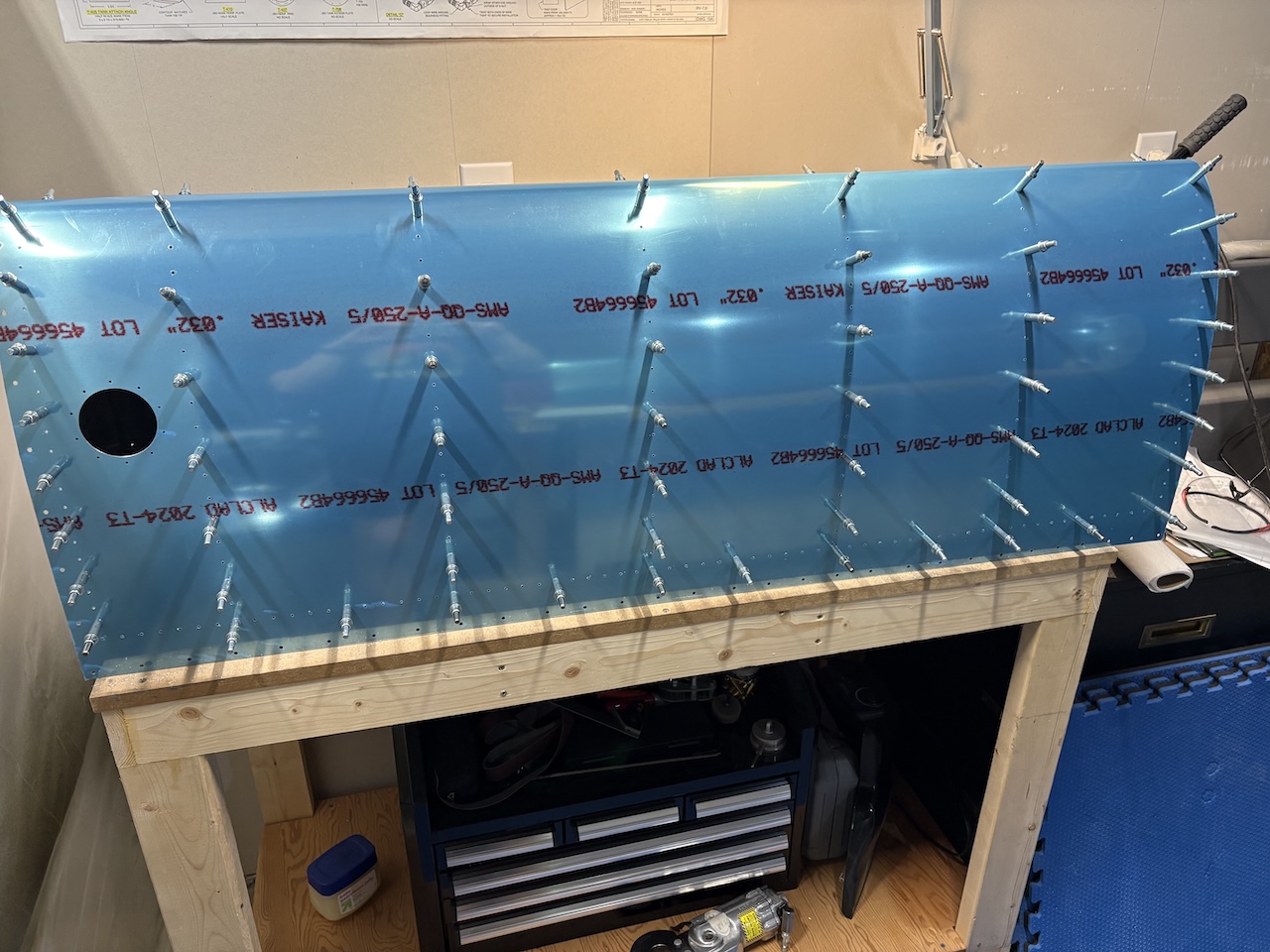 I had the tank skins clecoed to the baffles, spars, and leading edge joining plate and the fit looks really good. These skins are big so it was a bit of a wrestling match to get these on so it was a little frustrating when the next step is to take them off again.