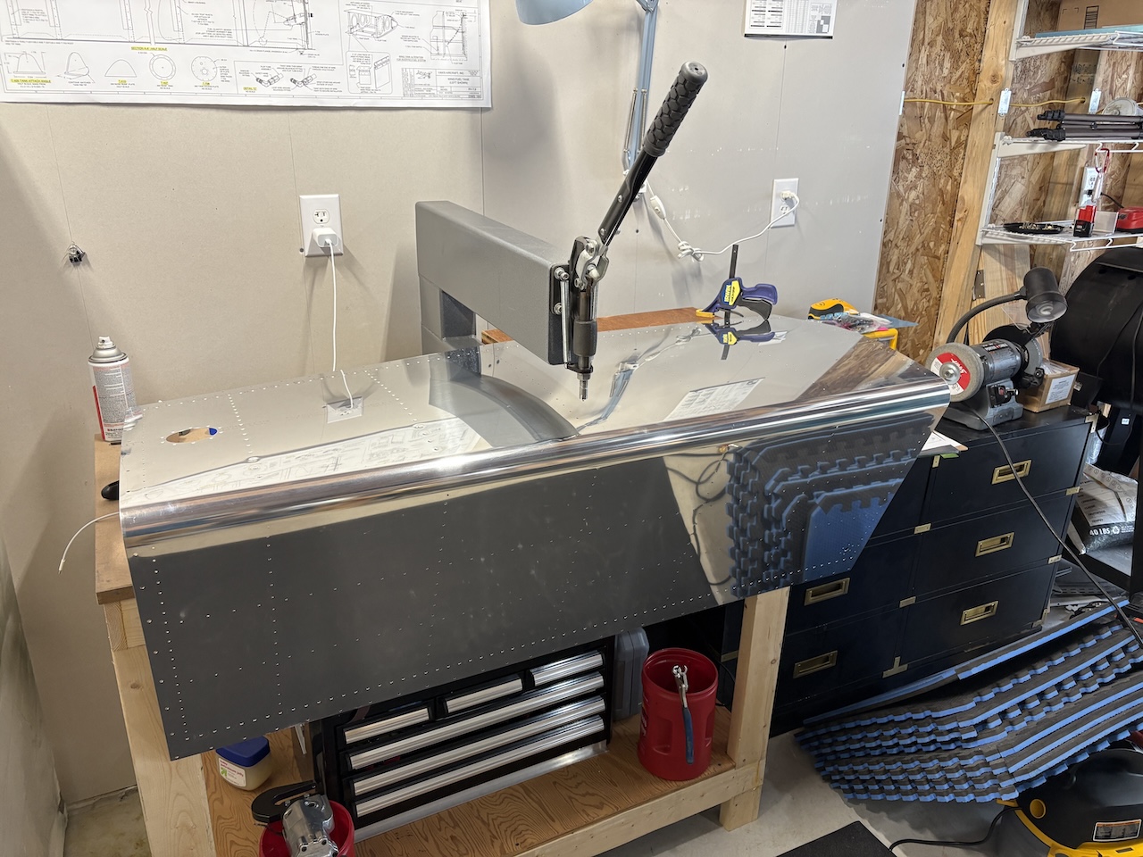 Just spent a while this afternoon working through all the tank skin dimples. I used the DRDT2 dimpler for to reach. This is a nice tool but it's not quick shifting the skins around to get to each hole. Here's the setup: