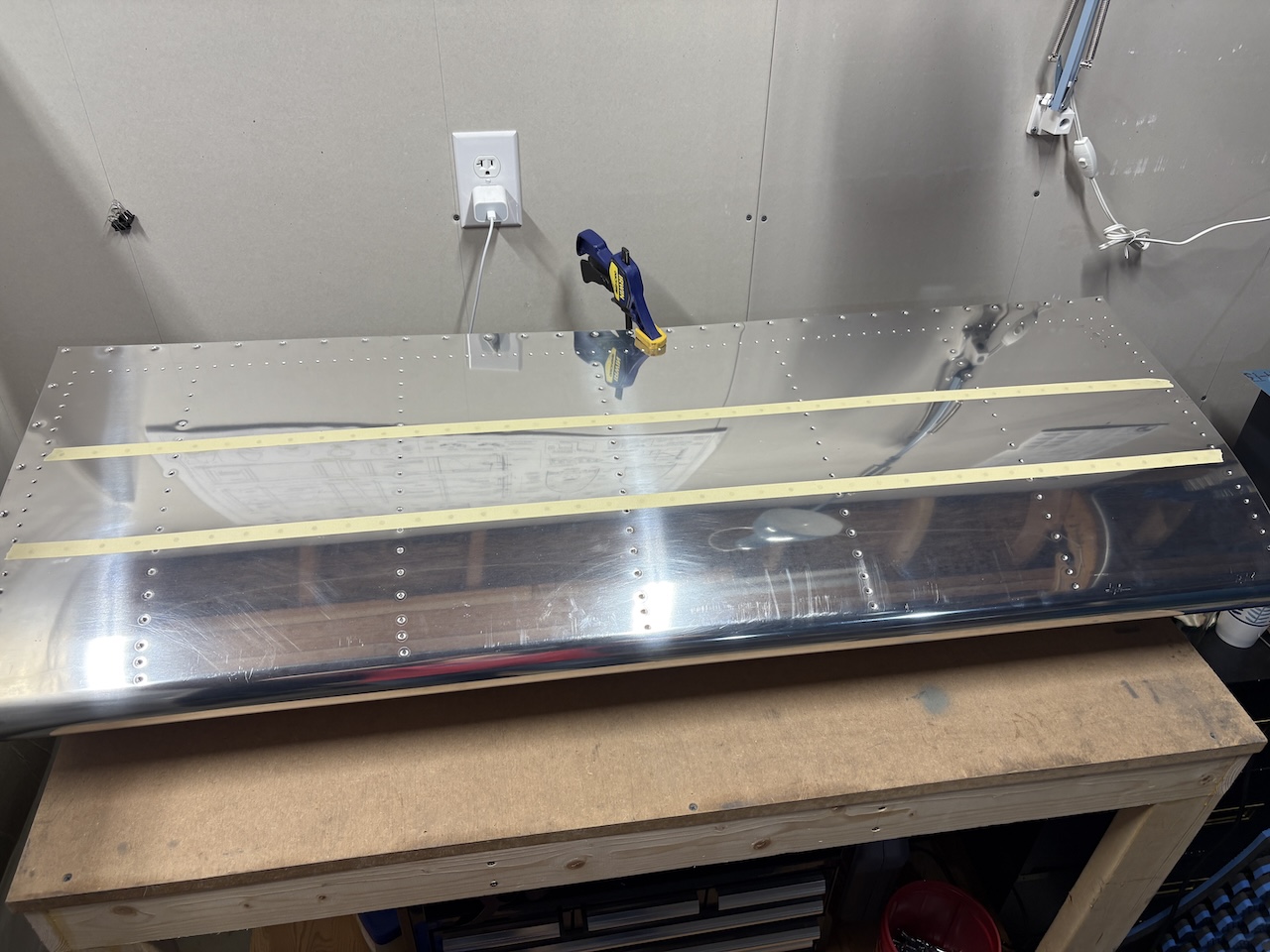 Today was the day! I had nothing left to do on the tanks but dive in to the tank sealant and start riveting this pile of parts together.The first thing is to clean everything to get all the dirt and oils off the parts to make sure the sealant has the best chance of bonding. I used lacquer thinner as my solvent of choice. Then I taped in the rivets in preparation for back riveting.