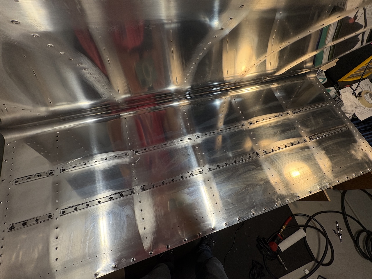 Then I mixed some sealant and buttered up the stiffeners, placing each on its rivets. Back-riveting went quickly with the most time consuming part being making sure that the back-riveting plate was underneath the rivets I was about to drive. After the rivets were all set, I cut off a small bit of aluminum tubing to apply sealant to the end of each rivet. I simply twirled the end of the tube in the sealant to pick up some and then spun it around the shop heads to seal them.
