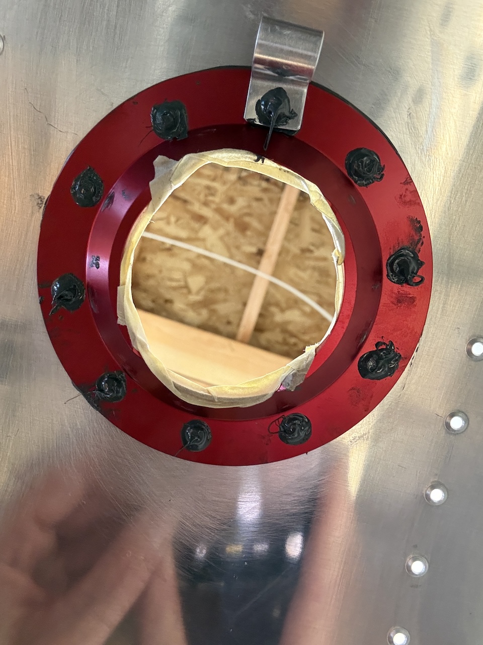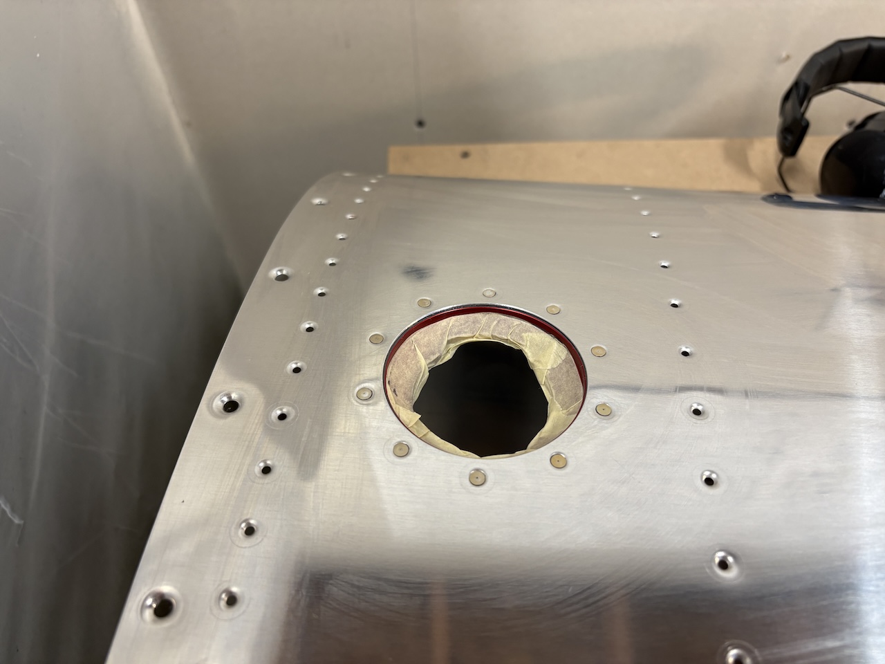 I did the right fuel tank stiffeners but didn't take any pictures...it looks just like two days ago with the left tank stiffeners.Then I moved onto fuel cap flanges. I took some care to make sure I got them correctly aligned with the curvature of the skin. Then I buttered them up with sealant, clecoed the forward and aft most holes, then set nine of the ten rivets with a standard mushroom flush set and bucking bar. The tenth was the forward-most rivet that also holds the tank vent line bracket and gets a longer rivet.