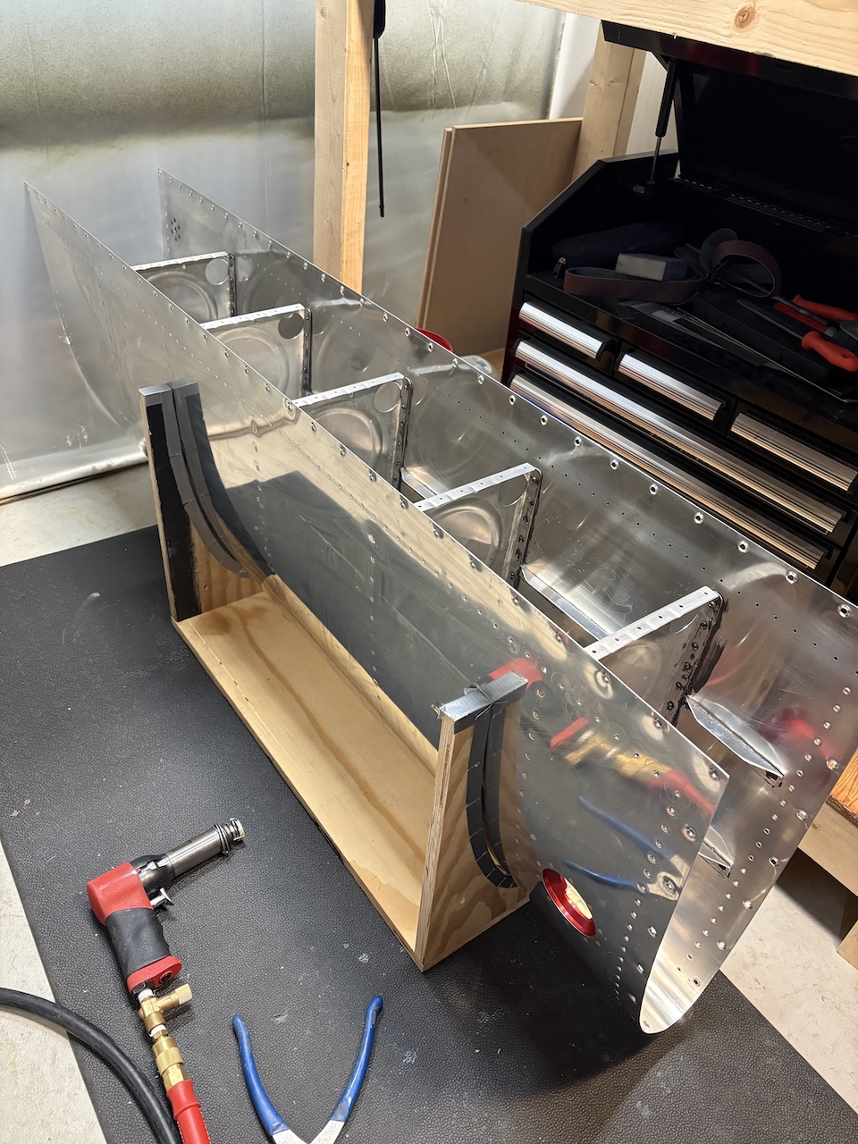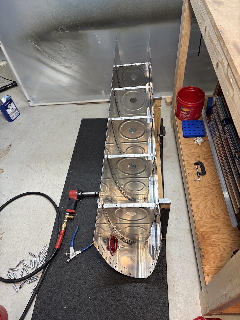 I finally had some time to work again and I pushed through a marathon fuel tank rib riveting session! I got through the remaining four interior ribs on the left fuel tank, and to be honest, I was pretty spent by the last one and probably should have stopped at three, but was careful and got them all in.I mixed up about 38 grams of sealant for the final two ribs in a single batch and that worked out quite nicely with not too much waste. I also used a scrap piece of aluminum sheet clamped to the workbench to mix the sealant on and that worked much better than paper or notecards or foil.