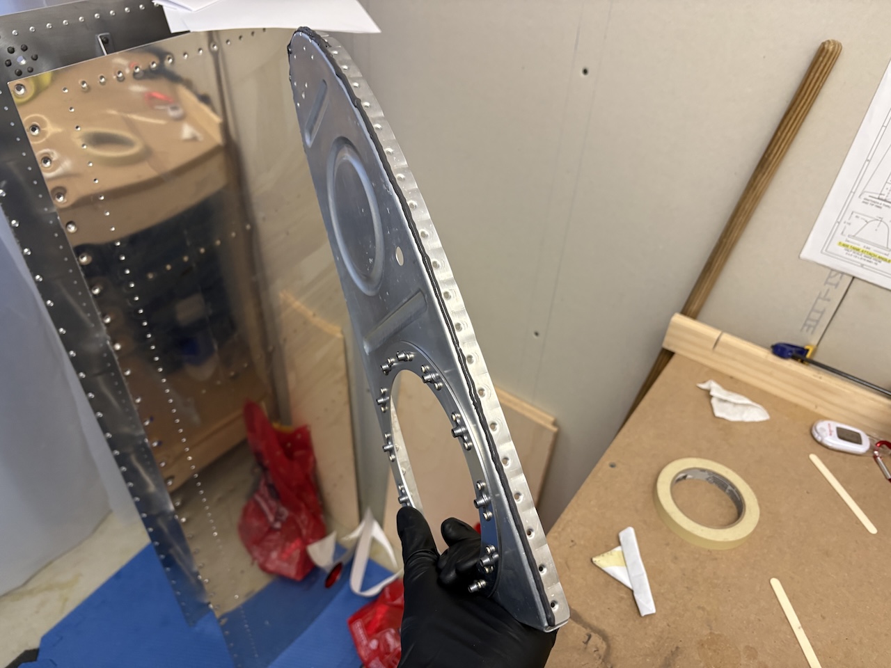 Slow but steady progress on the tanks. I got the outboard ribs installed. I started by attaching the doubler plate at the nose of the outboard rib. Just a smooth coating of sealant and then squeezing the rivets and it was done.