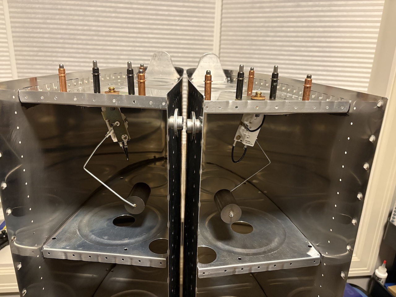 I spent far too long trying to bend the fuel floats to the exact measurement specified on the plans, and after fitting the left one, I think there is a typo on the length. It gives one of the dimensions as 3.75 inches and I'm pretty sure after fitting it that it is supposed to be 3.25 inches. Anyway, I got them bent and fit so that the full swing of the float arms stops about 1/8" from the top and bottom skins.