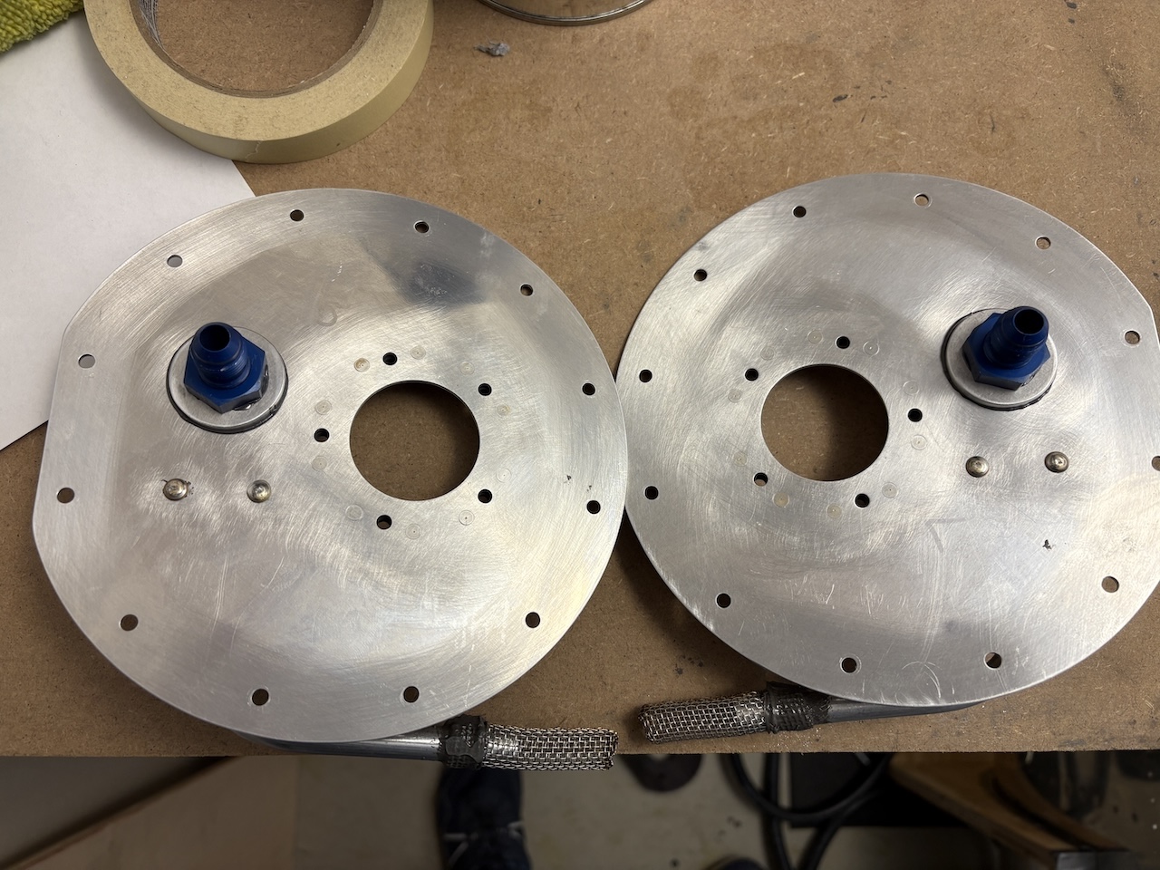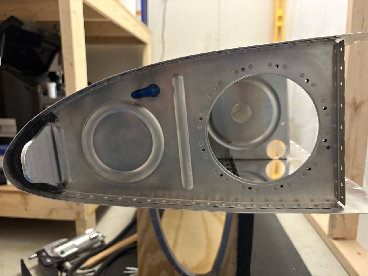 I feel like today was mostly futzing around rather than making solid progress, but I did end up moving the needle in the end. I got the fuel pickups installed on the access hatches. It's a bit finicky getting them torqued down and then getting the right anti-rotation brackets to sit flat but I got it done. Then I had to add some sealant to the fitting and brackets and get them in the hatch. Setting those to rivets was kind of a pain but the slanted edge of my skinny bucking bar did trick. I also smeared some sealant over the shop heads.
