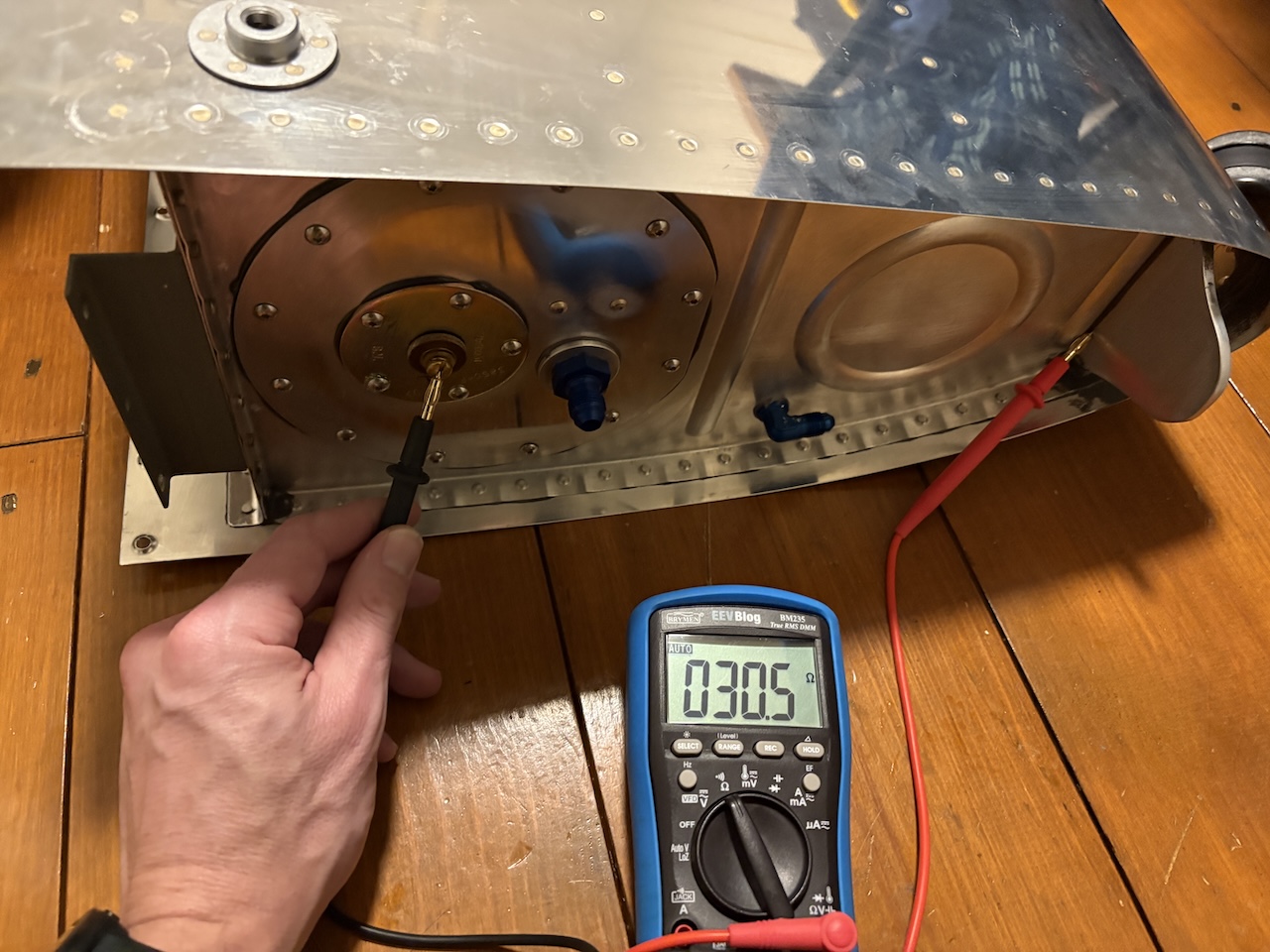 The full position reading 30.5 Ohms. I think the specs are somewhere around 32-240 Ohms so that's right where it should be. I also checked the ground continuity throughout the tank and it was rock solid. No matter where I took the readings with the ground probe on the tank, the resistance readings were identical. You can see I added a stainless steel star washer to a screw on the sender and one screw on the access panel to ensure good ground connection even if some sealant oozed out under the screw heads.