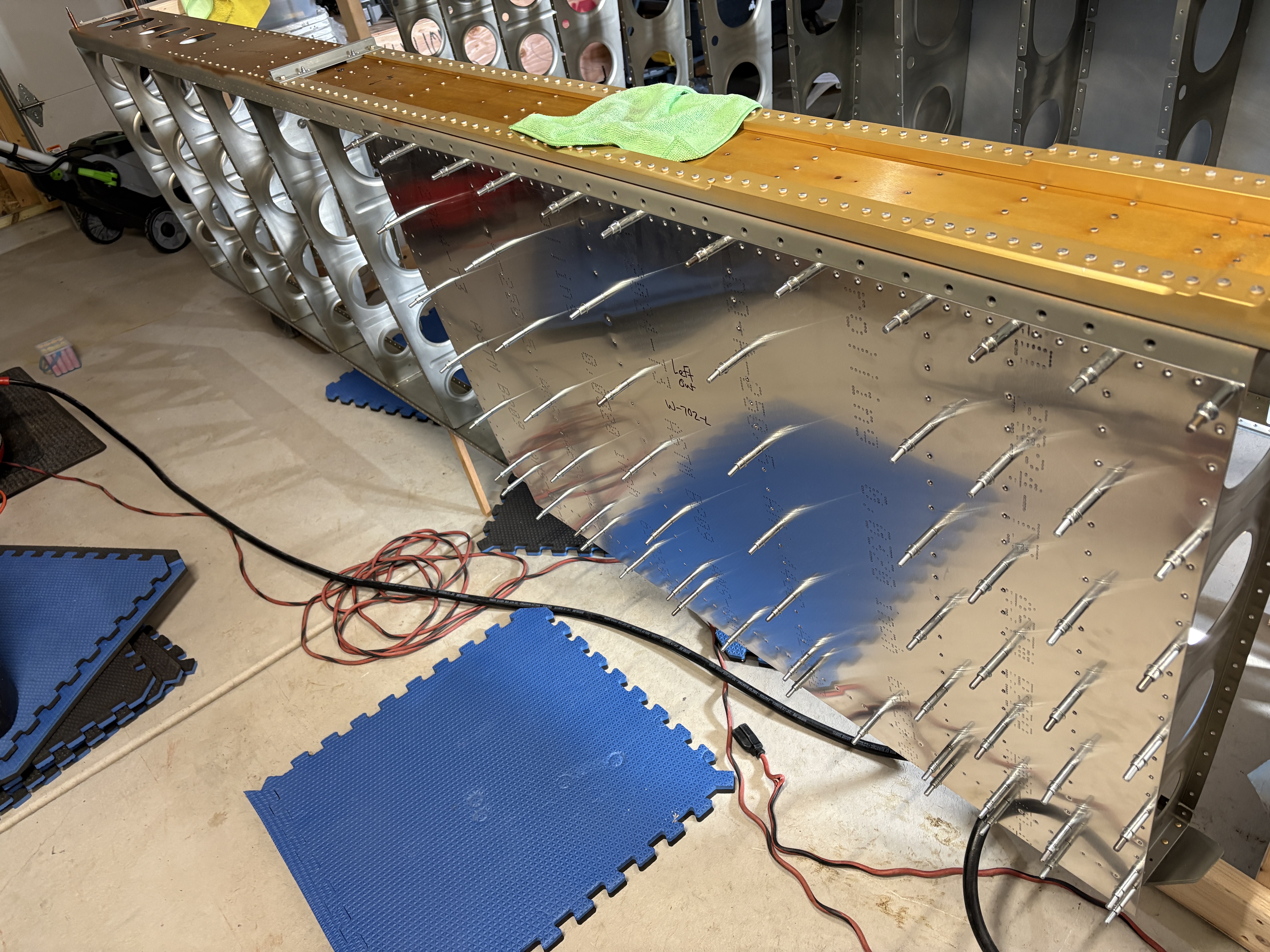 I continued to make sure the right wing is twist free, and in procrastinating the riveting of the right wing inboard top skin, I dimpled the left wing inboard top skin and hung it on the skeleton.