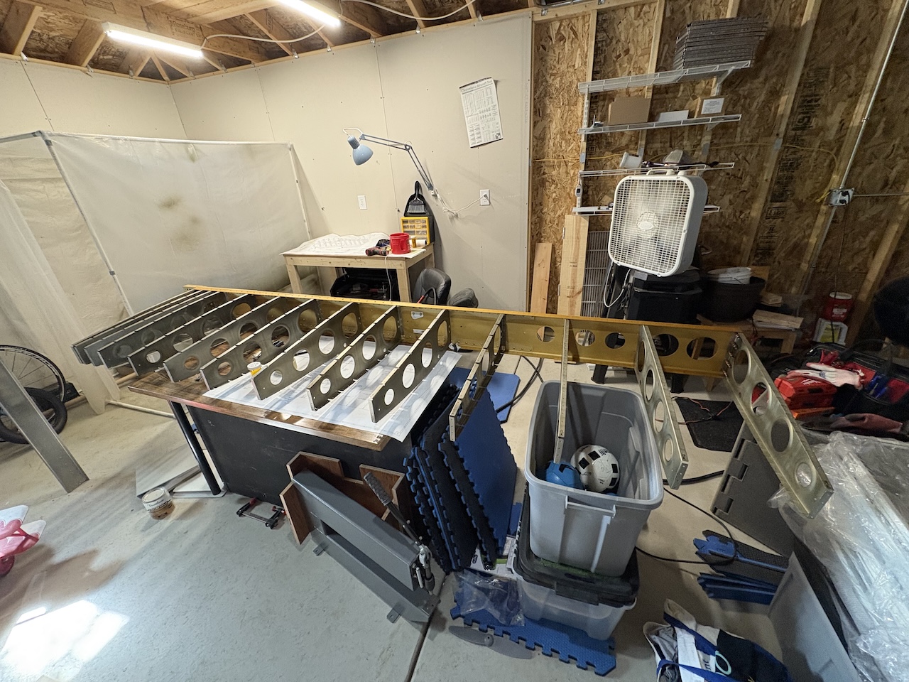 I moved the left wing to the floor to make room for the right wing and started riveting the ribs to the main spar again. I only made it about half way before I started to get tired and decided to stop before I made a mistake. It was so hot in the garage, that even with the box fan blowing directly on me, it was sweaty and miserable!