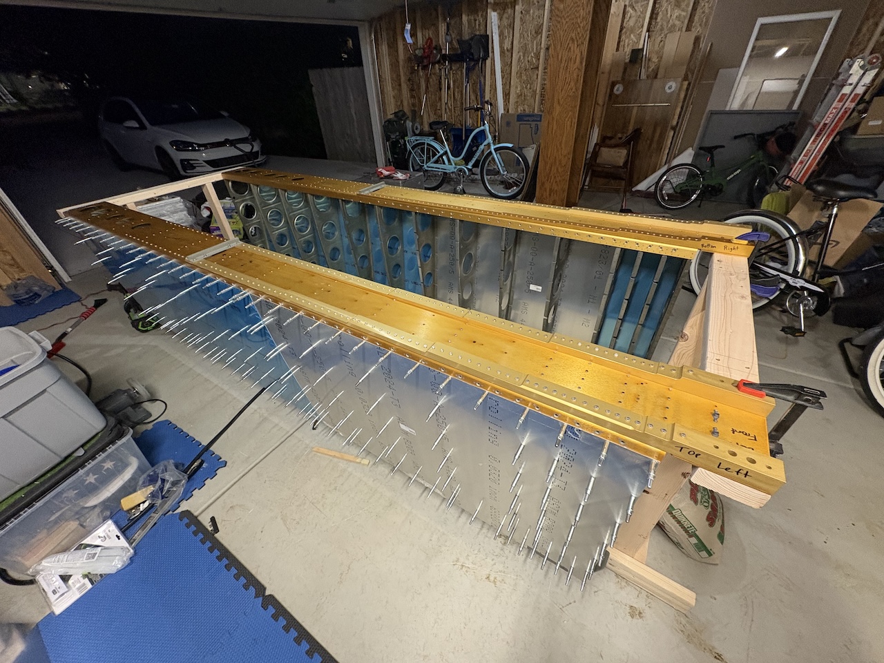 Moving forward, I got the wing skins down out of the garage rafters. This was easier said than done as the wings are now basically right under where the skins were stored in the ceiling so it took some gymnastics to get the skins (which are quite big!) down safely. Then, per the instructions, I clecoed the skins to the skeleton in every fourth hole. There are lots of holes, lots of clecos, and so much work ahead!Anyway, here the top skins have been hung on the skeleton. It is amazing how the wobbly skeleton becomes rock-solid as soon as the skins are attached! Next up will be match-drilling all the holes and then doing the same for the bottom skins.
