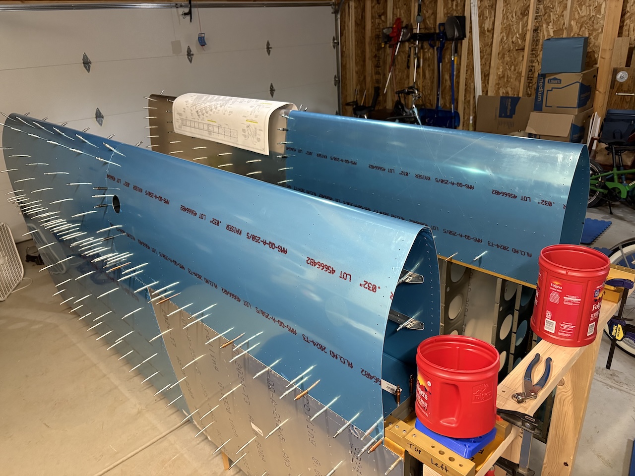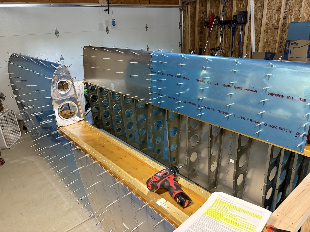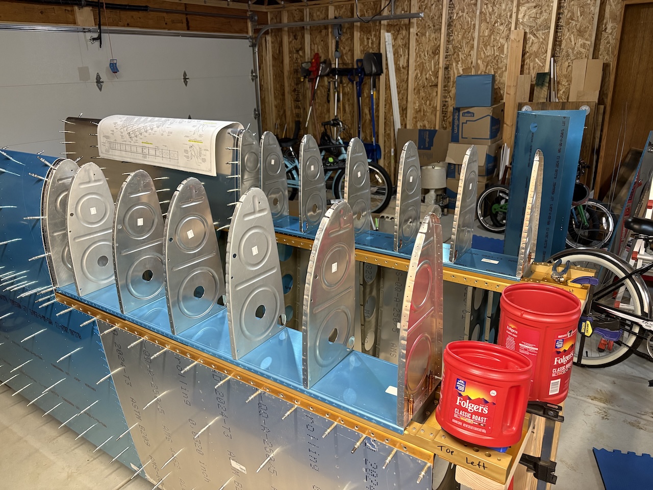 So took them off and then removed the blue vinyl from the inside of the skins. Then I put the tank ribs on the baffles and match drilled them to the baffles. I used the 12" long #30 to get at the holes. The most outboard tank rib was pretty finicky to get at because it was so close to the leading edge.
