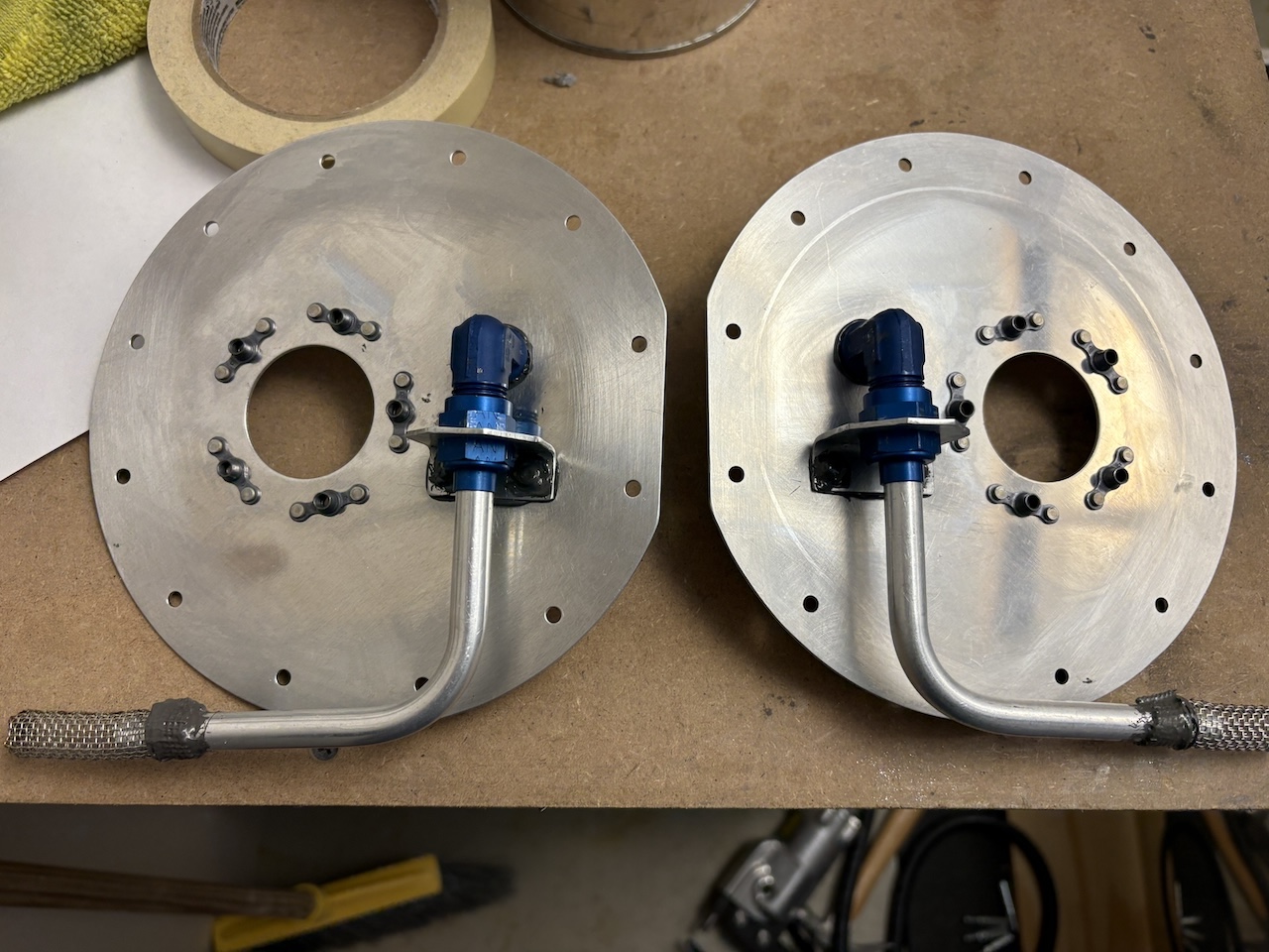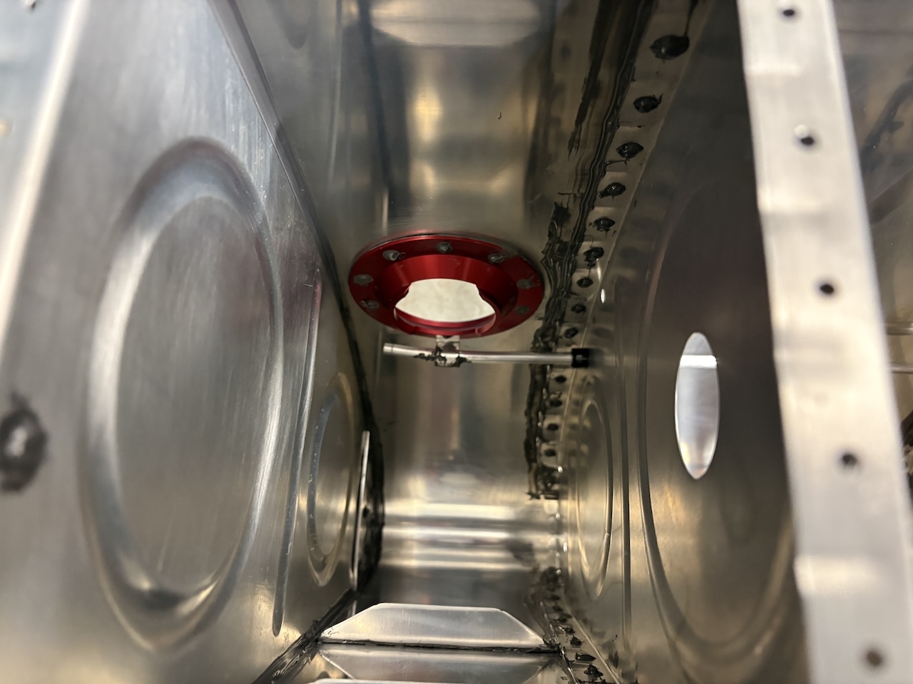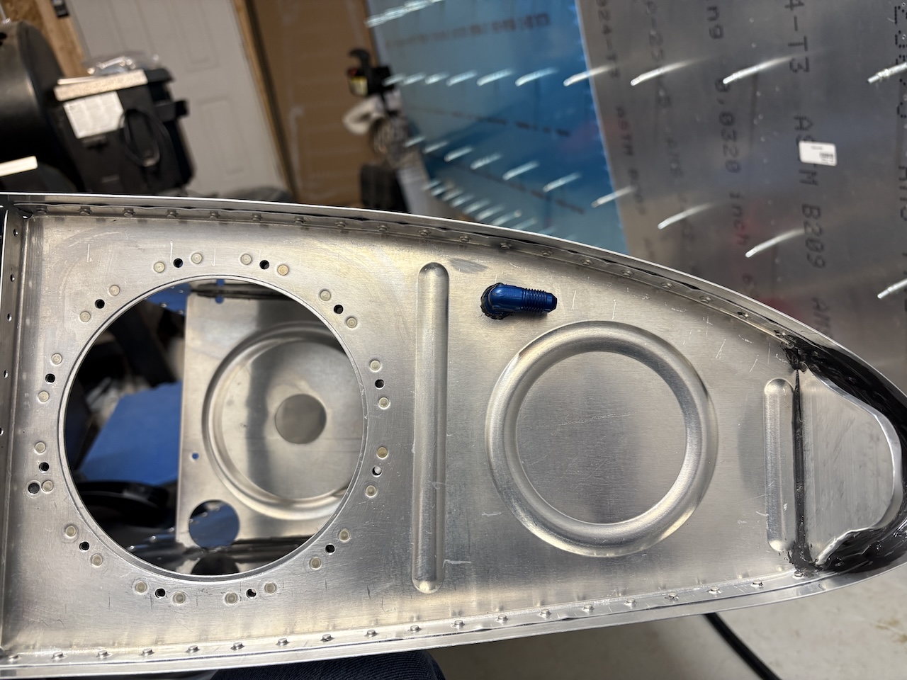 I feel like today was mostly futzing around rather than making solid progress, but I did end up moving the needle in the end. I got the fuel pickups installed on the access hatches. It's a bit finicky getting them torqued down and then getting the right anti-rotation brackets to sit flat but I got it done. Then I had to add some sealant to the fitting and brackets and get them in the hatch. Setting those to rivets was kind of a pain but the slanted edge of my skinny bucking bar did trick. I also smeared some sealant over the shop heads.