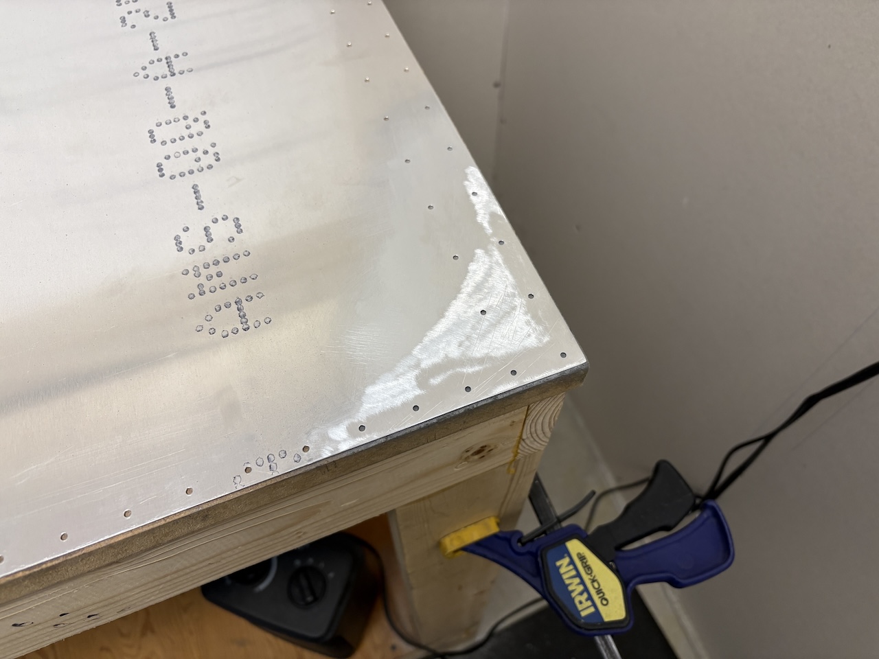 Then, I dimpled the leading edge skins with the pneumatic squeezer around the edges where it would reach and the DRDT2 dimpler for the center of the skins.