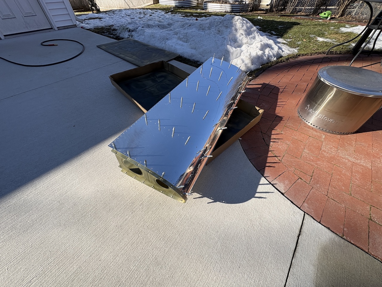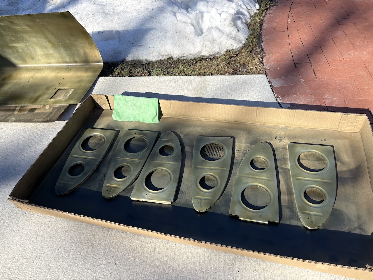 This is actually a combination of a few days of work. I cleaned the ribs with soap and a scotchbrite pad just in a little plastic bin, and then took the big leading edge skins up to the shower and did the same thing.A few days later, I cleaned the parts again but with lacquer thinner to get any oils off. Finally, I started priming the parts. It was just barely above freezing in the garage so I put the heat on in the little plastic booth. It's pretty miserable spraying in that thing and I only got one wing done. Fortunately, the next day was spring-like! It got up to the mid fifties outside and was sunny with a nice gentle breeze -- that meant I could do the spraying outside!