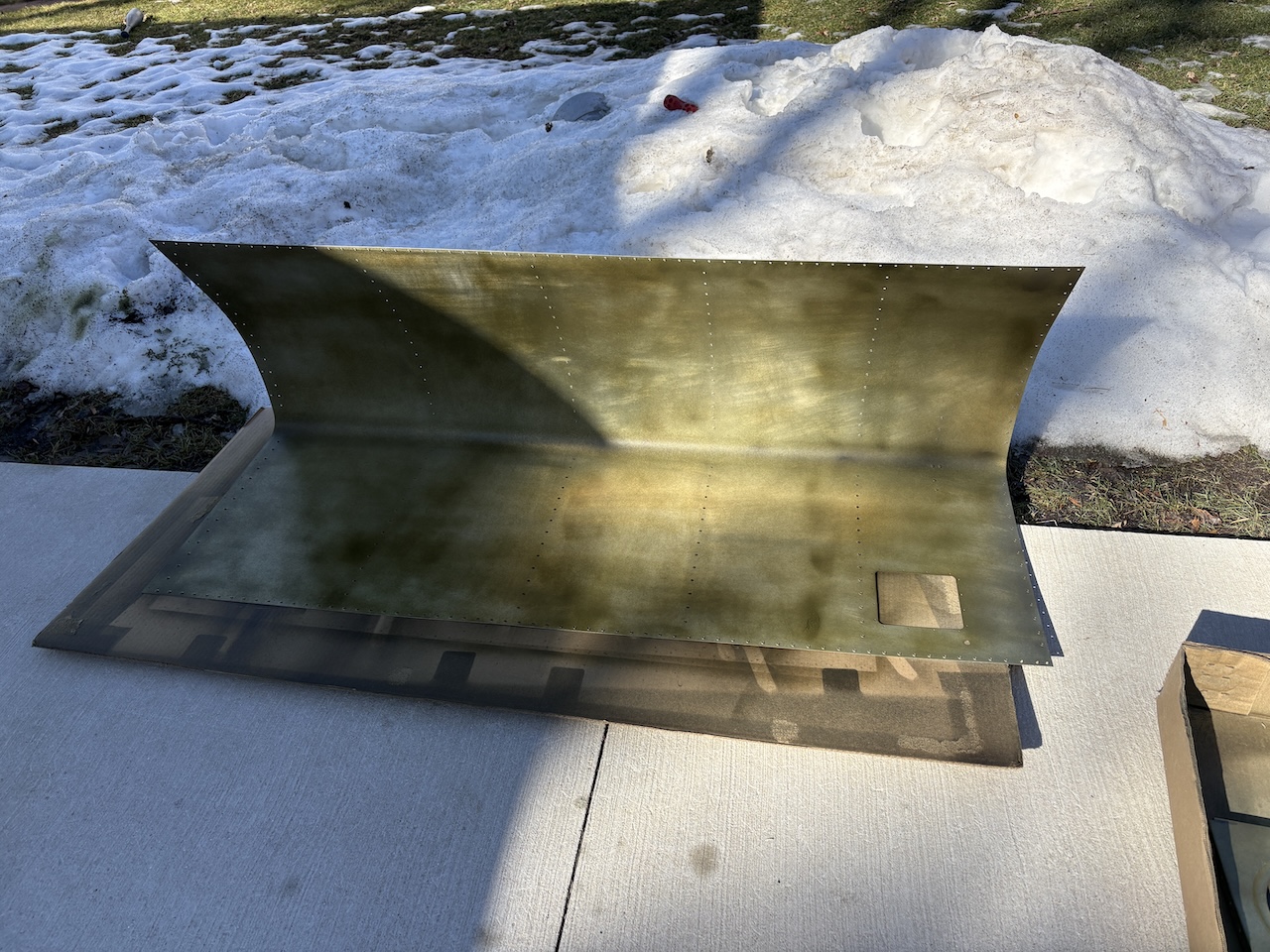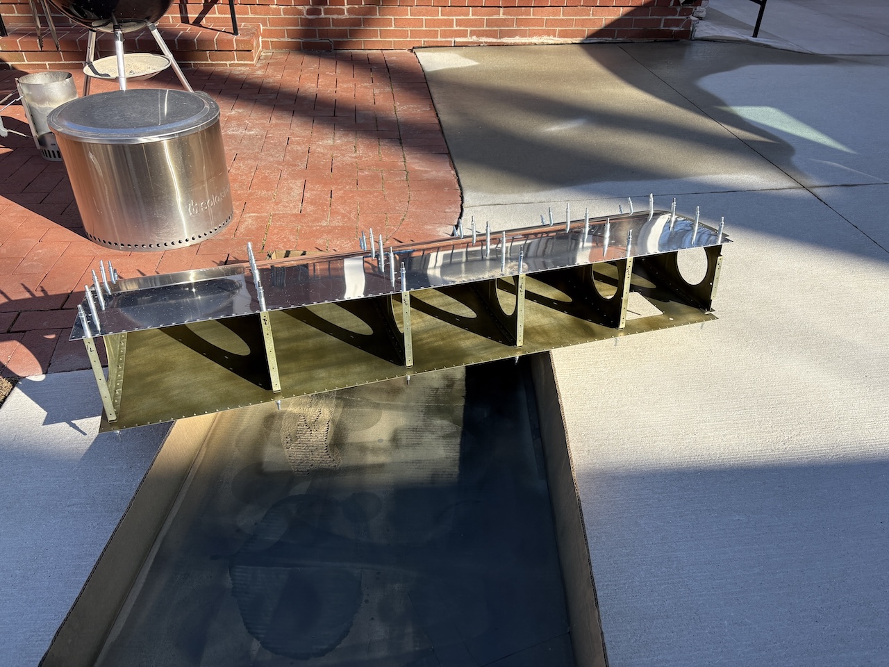 Leading edge done. I'm not using the correct settings on the gun so the primer is coming out in bigger drops than I think it should, leaving a very orange peel surface, but it is covering the metal, and this is all inside the wing so not visible. I cleaned the gun so I don't think that's the issue. It's probably not enough air but my terrible little compressor is basically maxed out so unless I get a new bigger one, this will have to do for now.