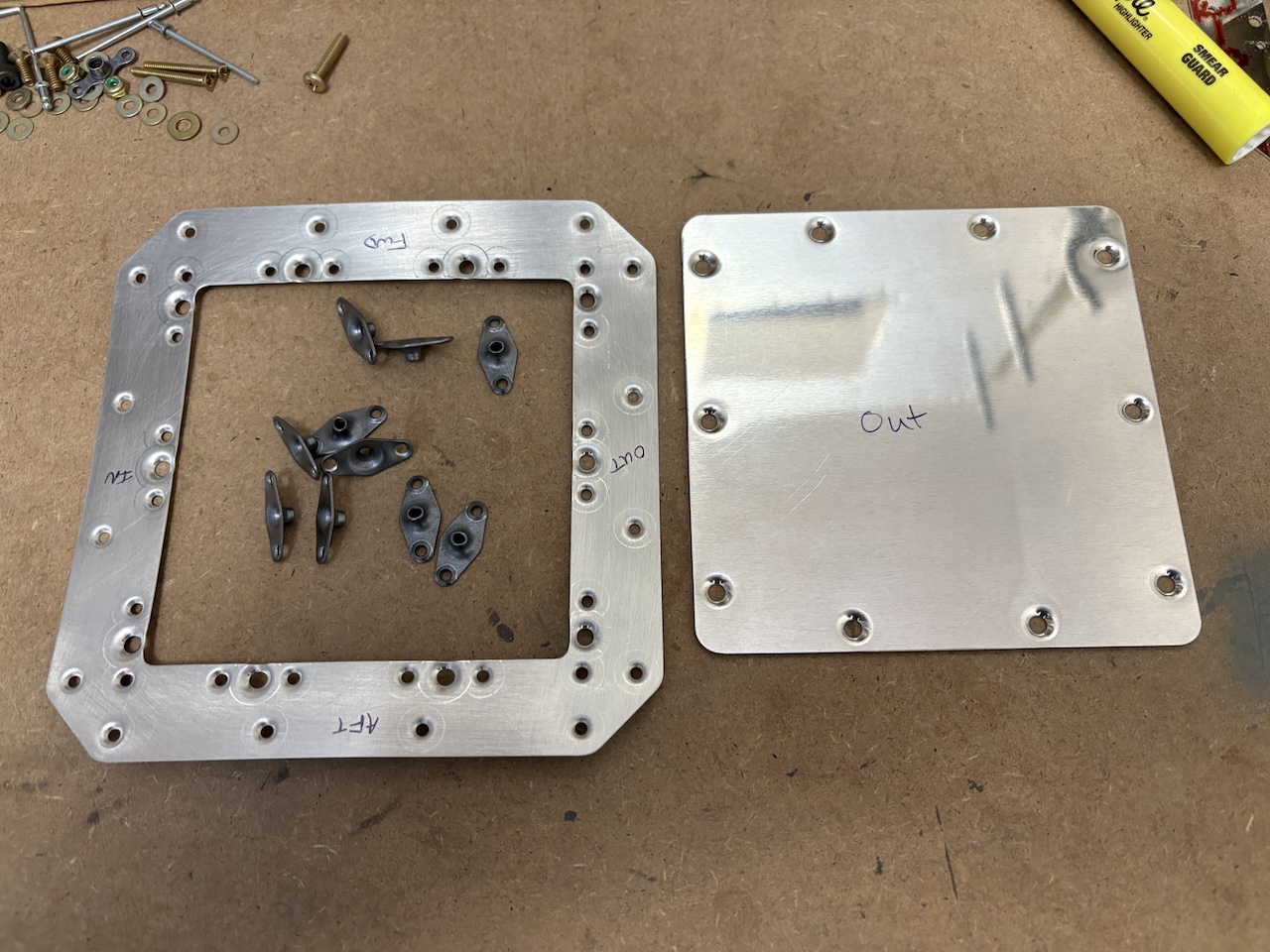 I gave the parts a scouring with the scothbrite pad and cleaned them with lacquer thinner, then just hit them with the spray can of self-etching primer. I didn't give it a long time to cure, just enough to dry to the touch so when I set the rivets to attach the nutplates, a bit of primer got scratched off but not too bad.
