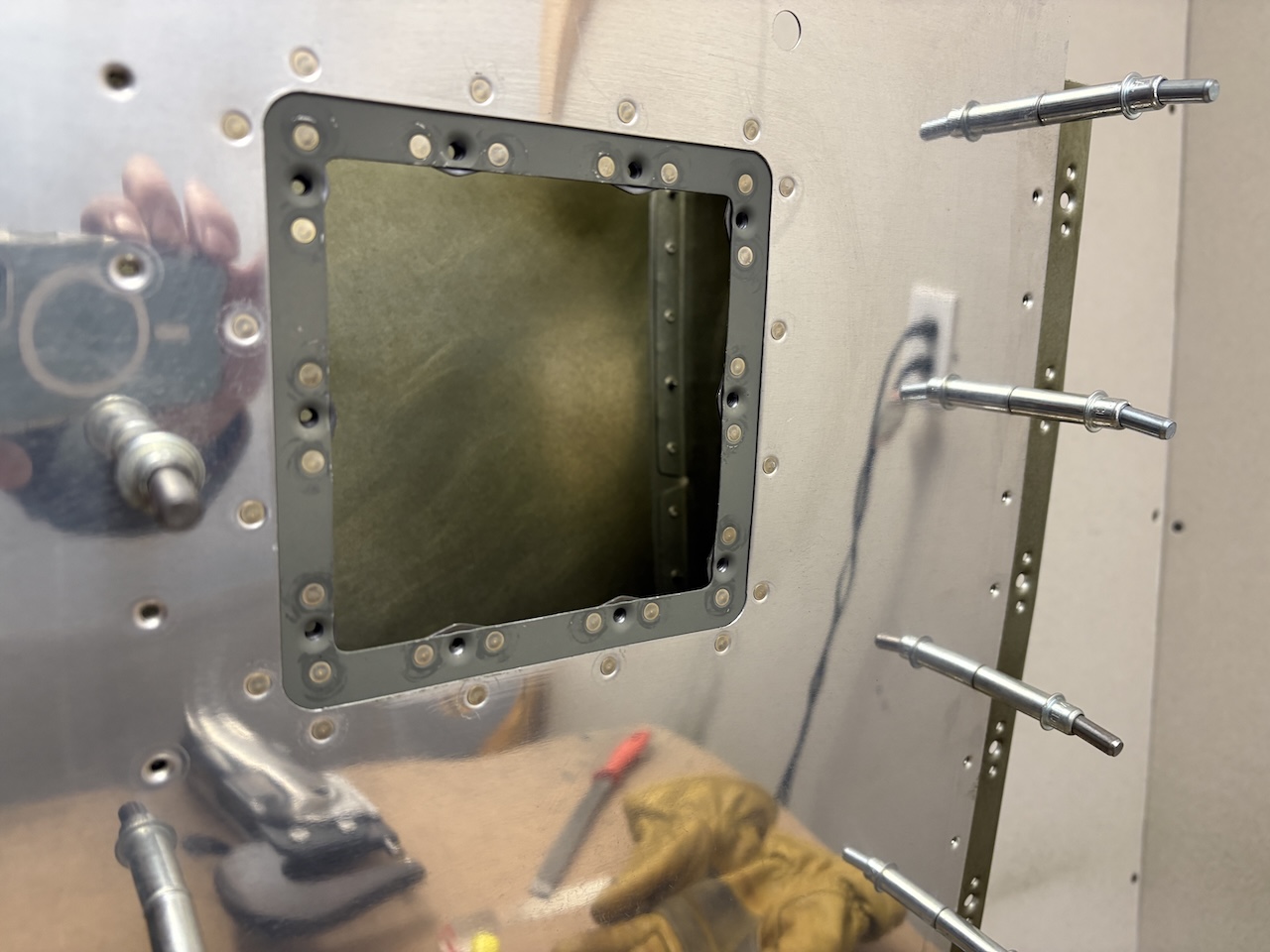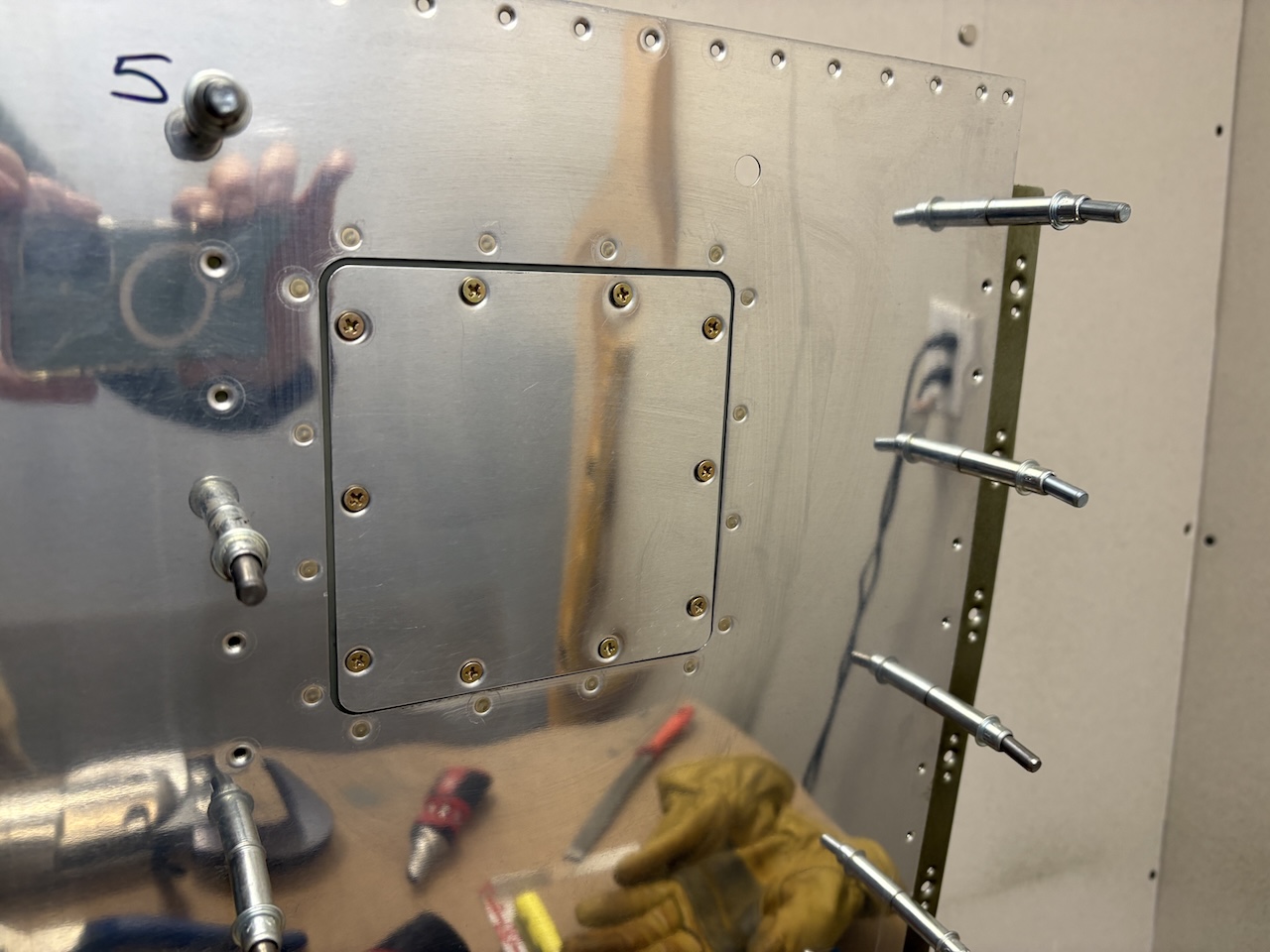 I put the doubler plate with nutplates in place on the skin and squeezed the 16 rivets to attach it to the skin. The doubler was pretty warped from dimples and nutplates but the rivets coerced it very nicely into shape on the skin.