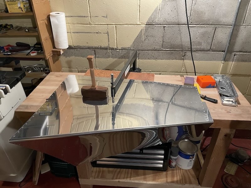 It was a very quick night of building. I just had to dimple the interior holes on the vertical stabilizer skin that I couldn't reach with the squeezer. It seems like every time I do this, I forget the way to setup the c-frame... I started with the male dimple die on the bottom and then was trying to move the die into the hole (blindly as it was below the skin) without scratching up the skin, while also holding the folded skin open wide enough to fit the c-frame inside, while holding down the skin to the dimple die, while whacking the top die in the c-frame with a hammer. Needless to say, I didn't have enough hands for that so I stopped being stupid, thought about it for four seconds, and remembered it's much easier to put the male die in the top piece, then the skin just hangs down naturally and there is no struggle for space inside the folded skin as the hammer/whacking business happens outside -- no wrestling required.