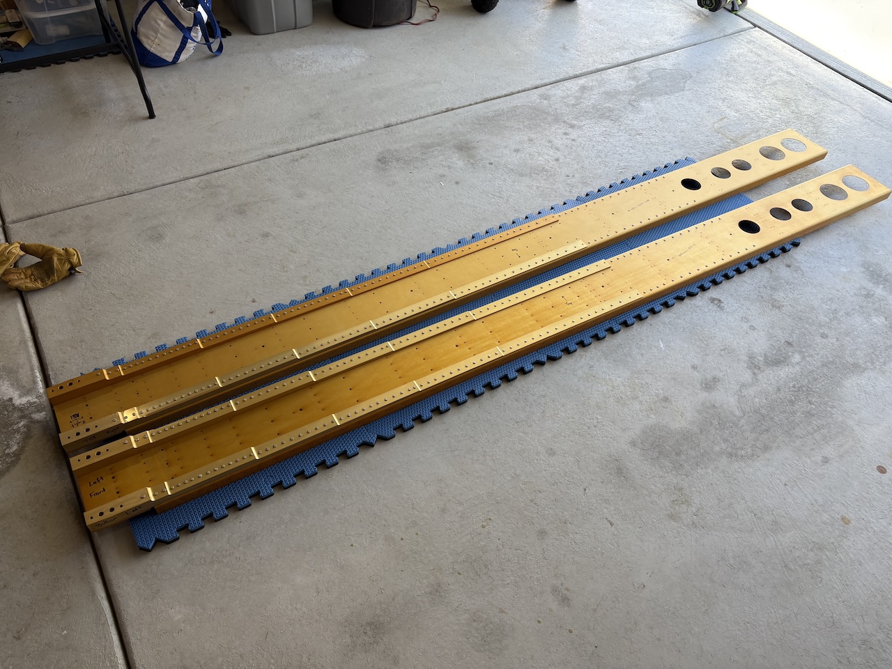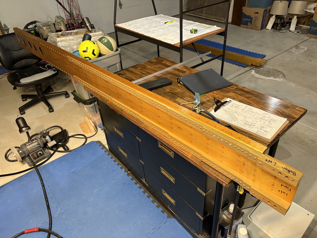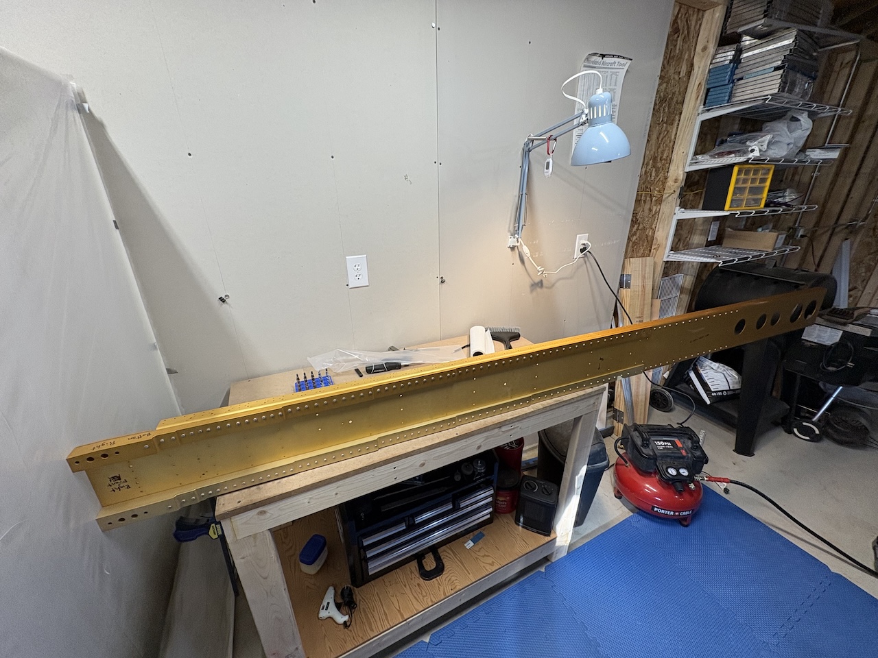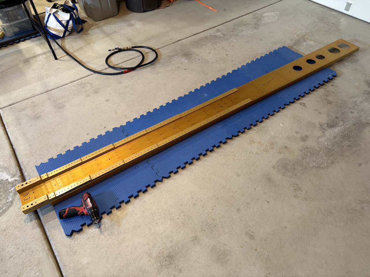 It's been very cold here lately so I haven't exactly been motivated to get out in the garage and work. Today the temperature made it above 30 for the first time in weeks so I got out there and started on the wings!First thing I had to do was get the spars down from the garage rafters. I did some rearranging and put the elevators and rudder up there where the spars were to free up some space and keep them safe.