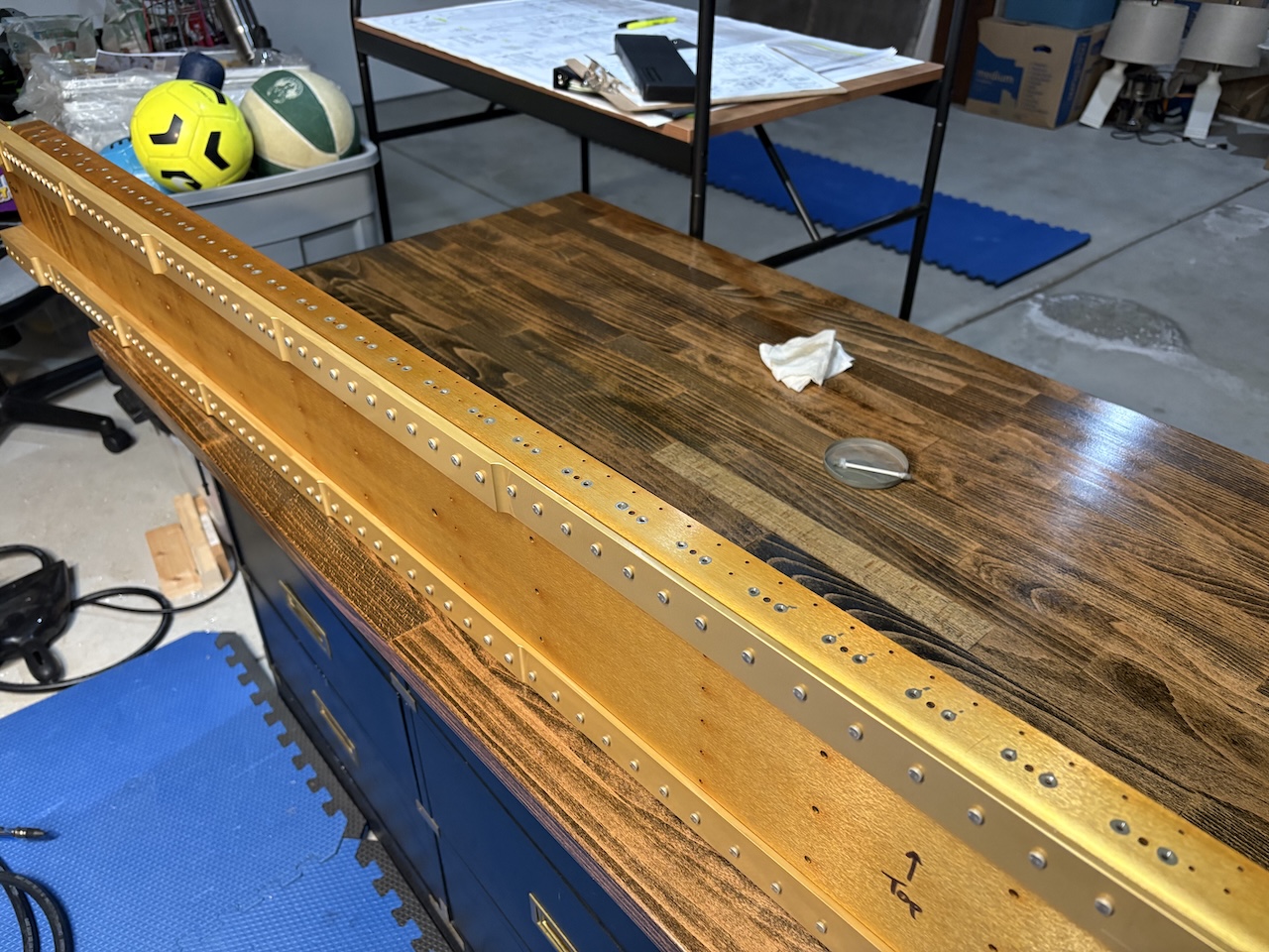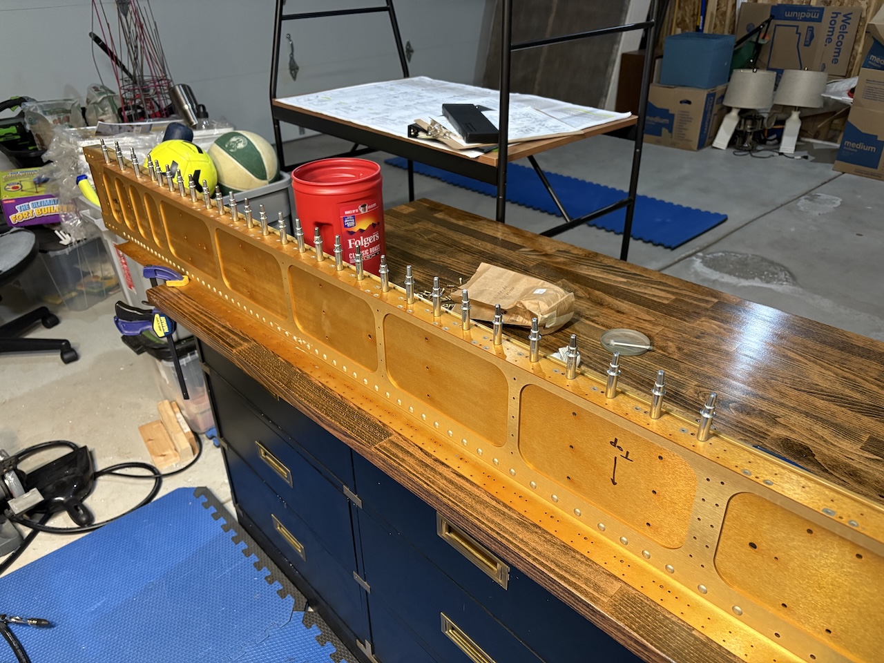 Then I clecoed the nutplates to the spar. I only got half of one wing done as this takes a while and I can't flip it over and do the other side due to the clecos. I'll set the rivets in the empty holes next, remove the clecos and set the other rivets, then flip the spar and do the same process on the other side, then do both of those steps on the other spar. Lots of little dextrous work to do and my fingers weren't working particularly well in the cold tonight.