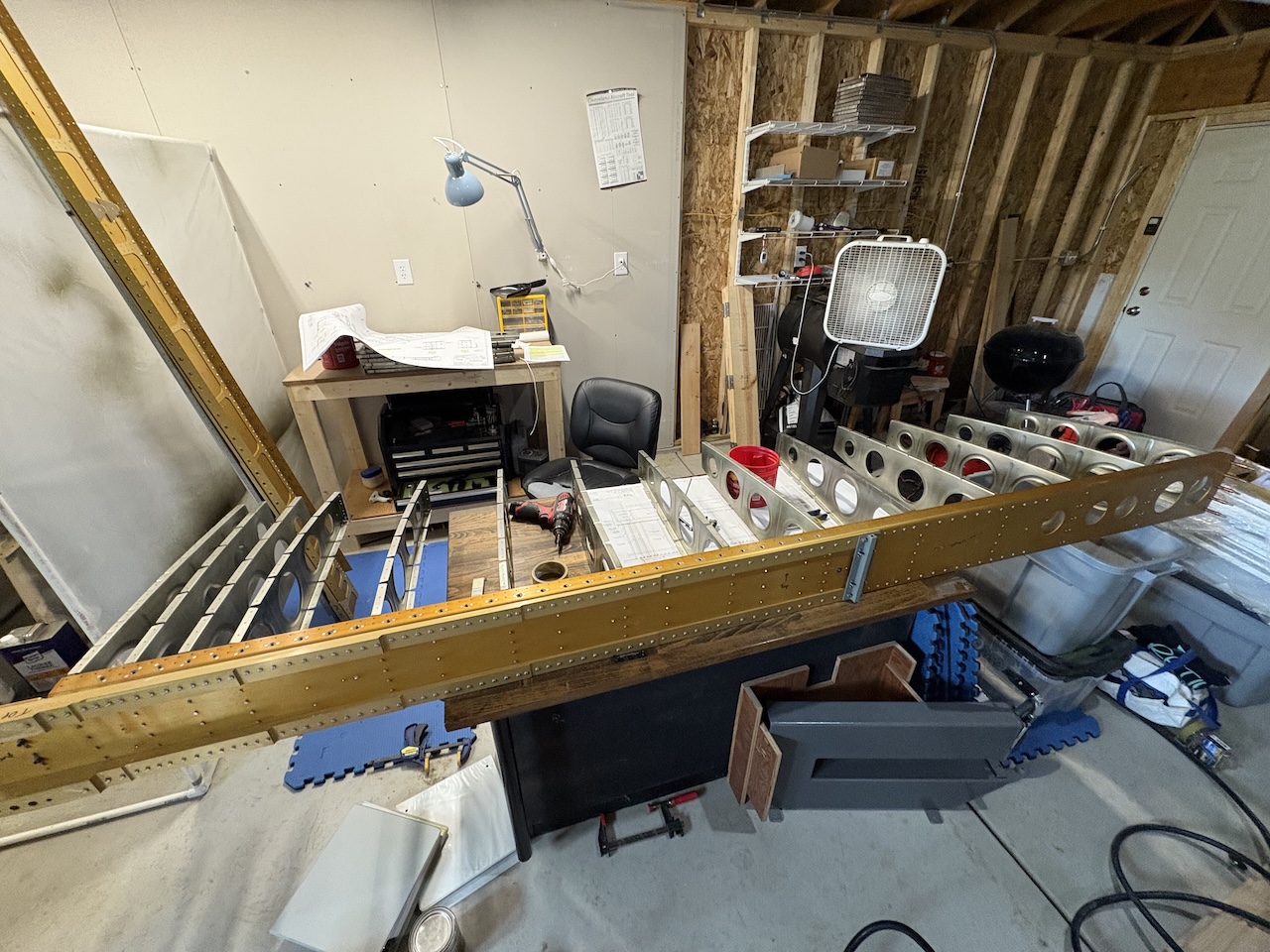 I moved the left wing to the floor to make room for the right wing and started riveting the ribs to the main spar again. I only made it about half way before I started to get tired and decided to stop before I made a mistake. It was so hot in the garage, that even with the box fan blowing directly on me, it was sweaty and miserable!