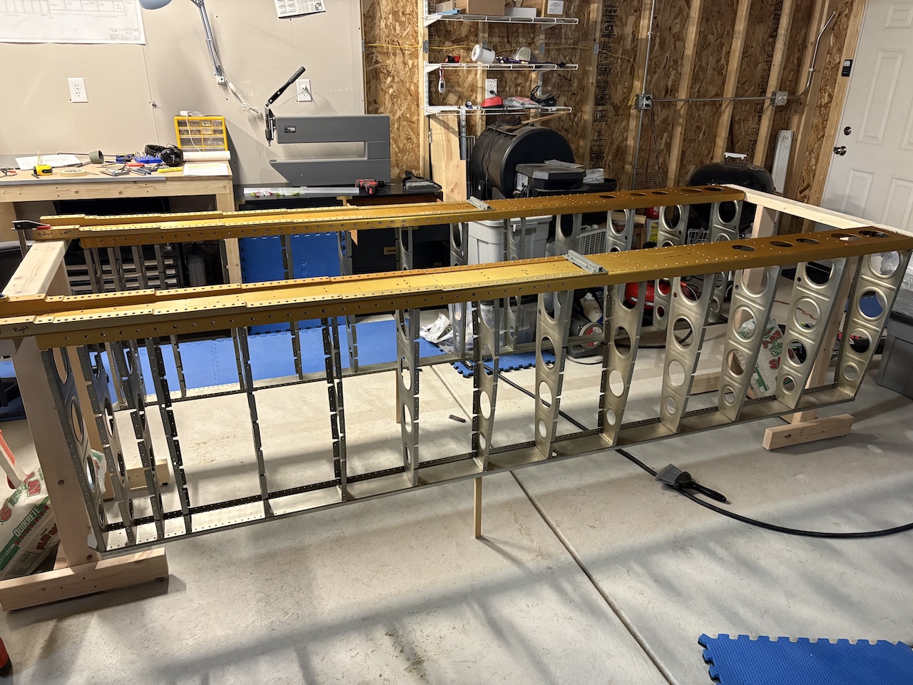 I made one stand about 1.5" taller to account for the slope in the garage floor. I also used adjustable feet so that I could level them out nicely and eliminate the wobble. A laser level allowed me to get both stands level and in-plane with each other. I also cut some sticks to prop up the middle of the rear spar to help eliminate sagging.