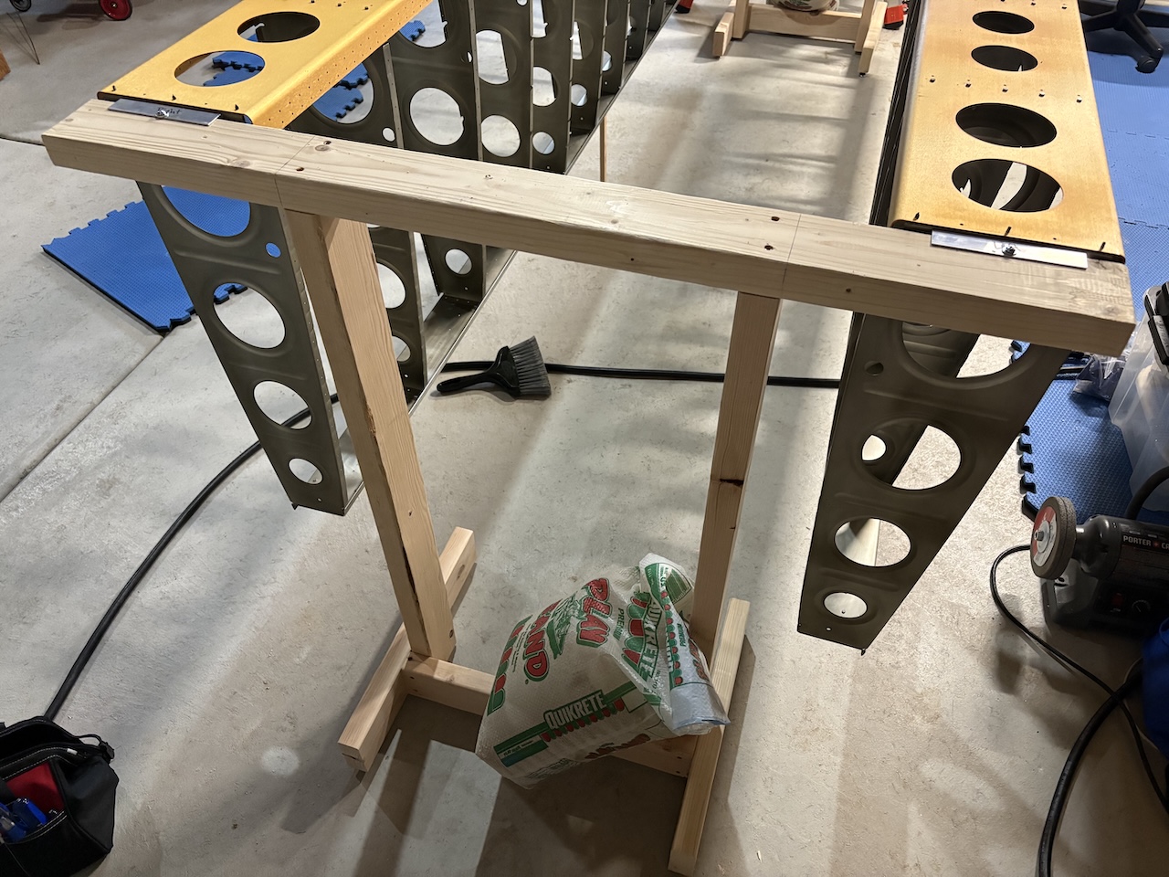 Now that I have some assemblies that look like giant airplane parts, it's time to make someplace to hang them. The plans and instructions give an example of what to build as a stand for the wings. They don't need a precision jig to ensure that they are straight because of the pre-drilled holes. That means the stands just need to hold the wings during the build process and be reasonably plumb and level.I couldn't/didn't want to do the 4x4 posts from floor to ceiling because my garage doesn't have a ceiling and I didn't want to drill into the floor so I went with 2x4 stands. They are 36" tall and the gap between the uprights on the stands is 20". It's wide enough that you can climb through and work from between the wings which end up being about 24" apart.